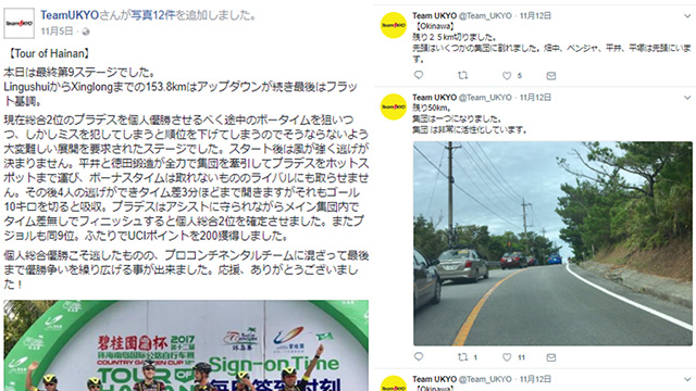 桑原氏:ただ、国によってレース場の電波状況等のインフラが整っていない場合や、主催者側の対応次第によっては、ライブビューイングができないこともあってね。。。本当に重要な情報は主催者側が審判カーに備わっている無線で連絡をしてもらっているけど、視聴者やファンの方々にレース中の正確な現状把握をしていただけるには情報が不十分で。なのでもう1つの使い方として「Twittter」を使って私が実際の状況を生中継で伝えることをしています。Facebookも使用しているけど、「Facebookの使い方」としてはレース前のプレゼンとかレース後の結果を発表したりするときに使うね!そんな感じでレース中は、ライブビューイングができる環境ならライブビューイングで、環境がないときはTwittterで中継してるよ。Twitterだと視聴者やファンの方々から「今チェックしてますよ!」「応援しています!」などのコメントが多く飛んでくるのが嬉しいよね!