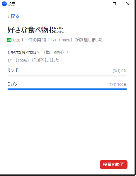一定時間経過したら右下の赤いボタン「投票を終了」より投票を締め切ります。