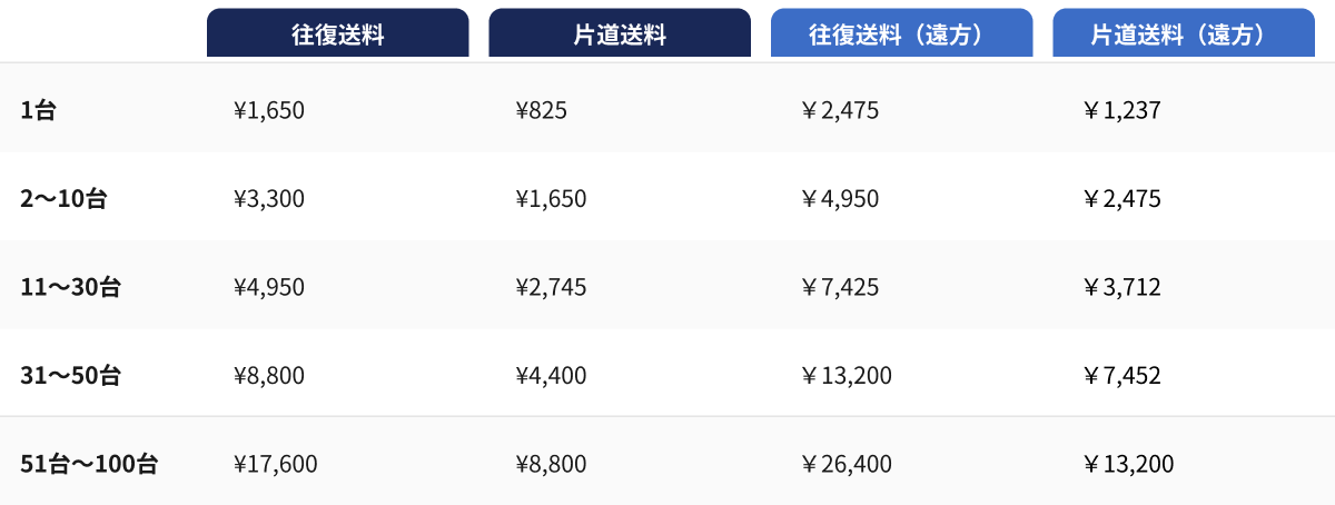 送料は、レンタル台数やお届け先地域により異なります。お見積もり時に、送料を含めた合計金額をご案内いたします。