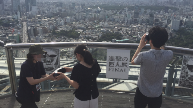 ププルでは、六本木ヒルズ森タワー屋上スカイデッキにて開催された「進撃の巨人展FINAL×SKY DECK~超大型巨人襲来~」VR・AR体験でご利用いただくVRゴーグルとスマートフォンのセットをご提供致しました。 スカイデッキから超大型巨人が出現するという大迫力のコンテンツとなっており、屋上スカイデッキは55階という最高のロケーションの中で東京の街を一望しながら、進撃の巨人の世界をご堪能いただきました。会場はヘリポートにもなっており、なかなか一般の方が立ち入ることができないような大スケールの会場での開催となりました。